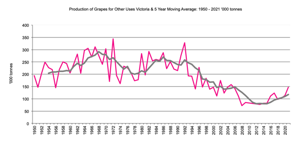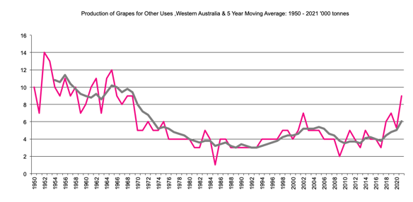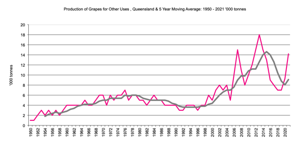 Production of grapes, Other Uses ( fresh, dried) '000 tonnes,5 year moving average