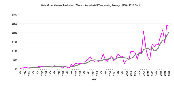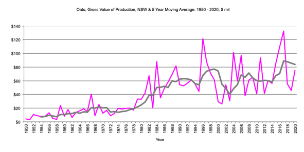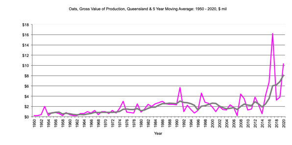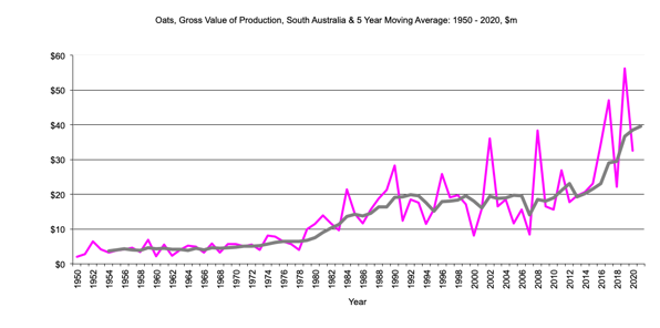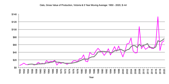 "Oats - Gross Value of production, $m, 5 year moving average"
