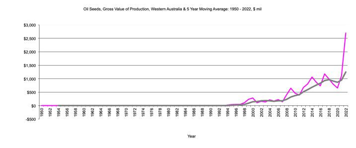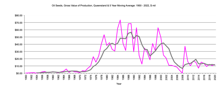 Oil Seeds - Gross Value of production, $m, 5 year moving average