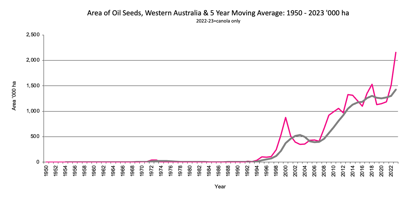 From almost nil area in the early 1990s the area of oil seeds in Western Australia reached around one million hectares.
