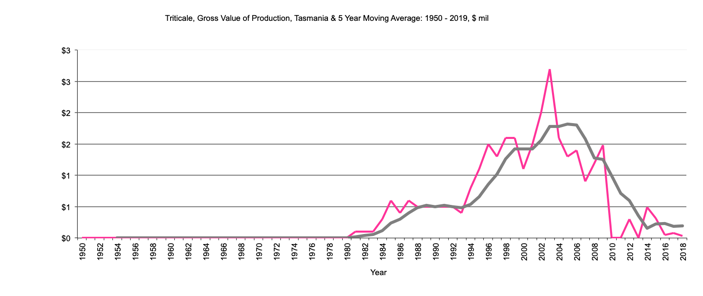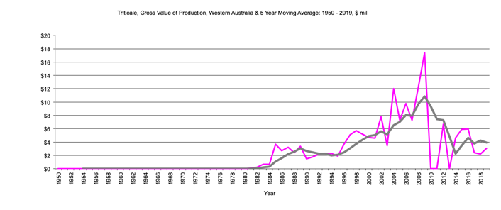 "Triticale - Gross Value of production, $m, 5 year moving average"