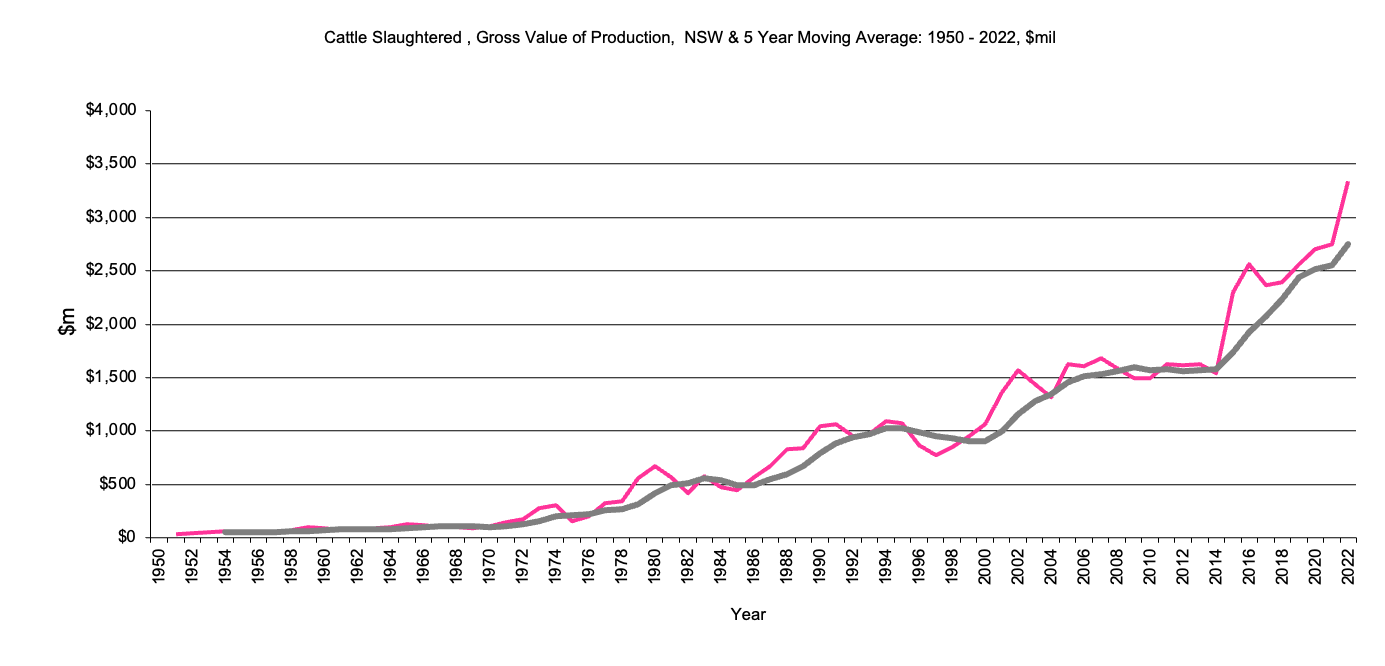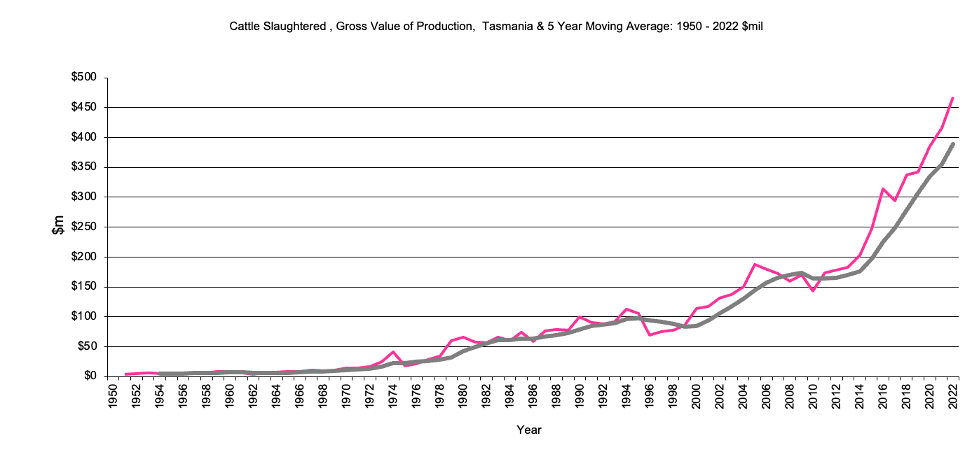 Cattle Slaughtered - Gross Value of production, $m, 5 year moving average