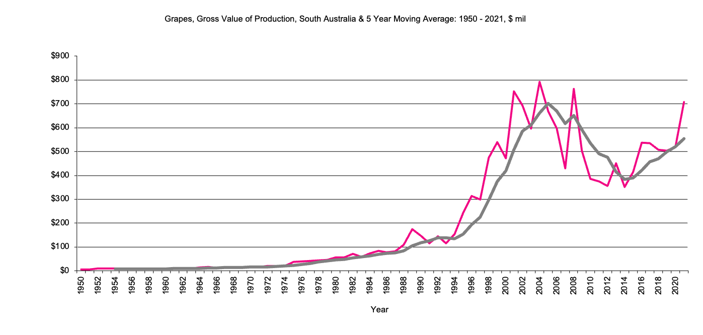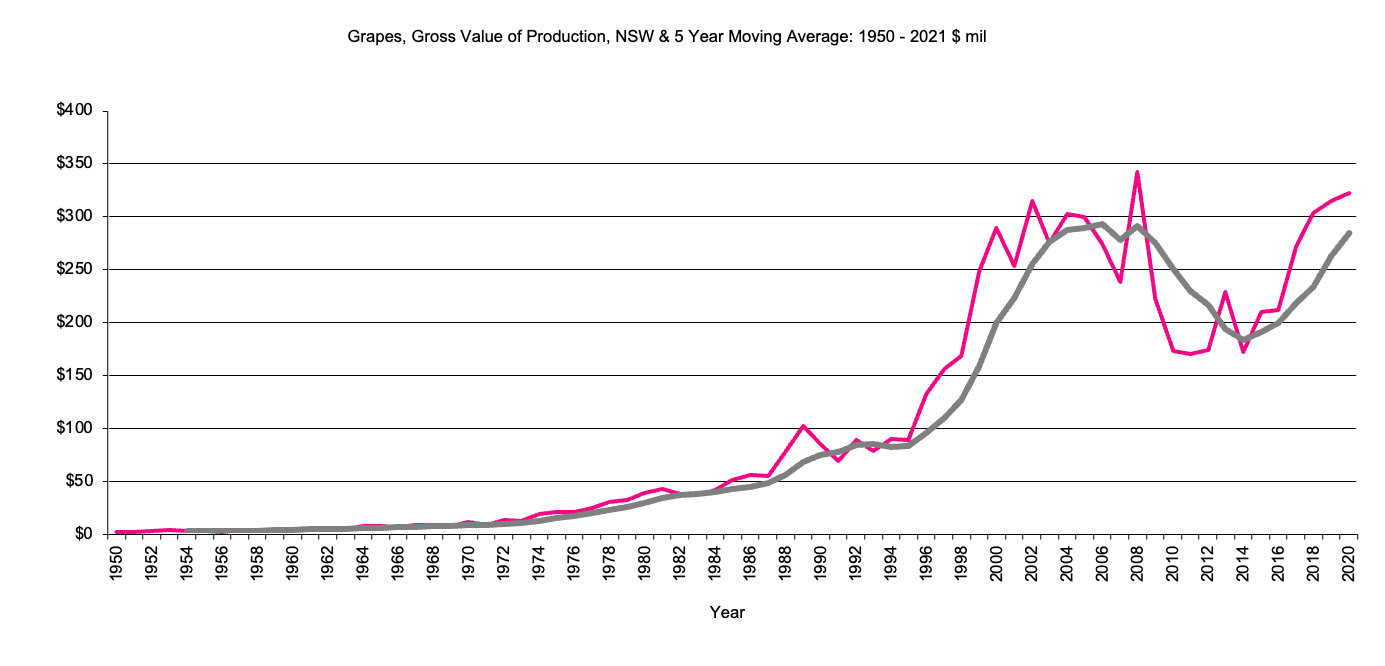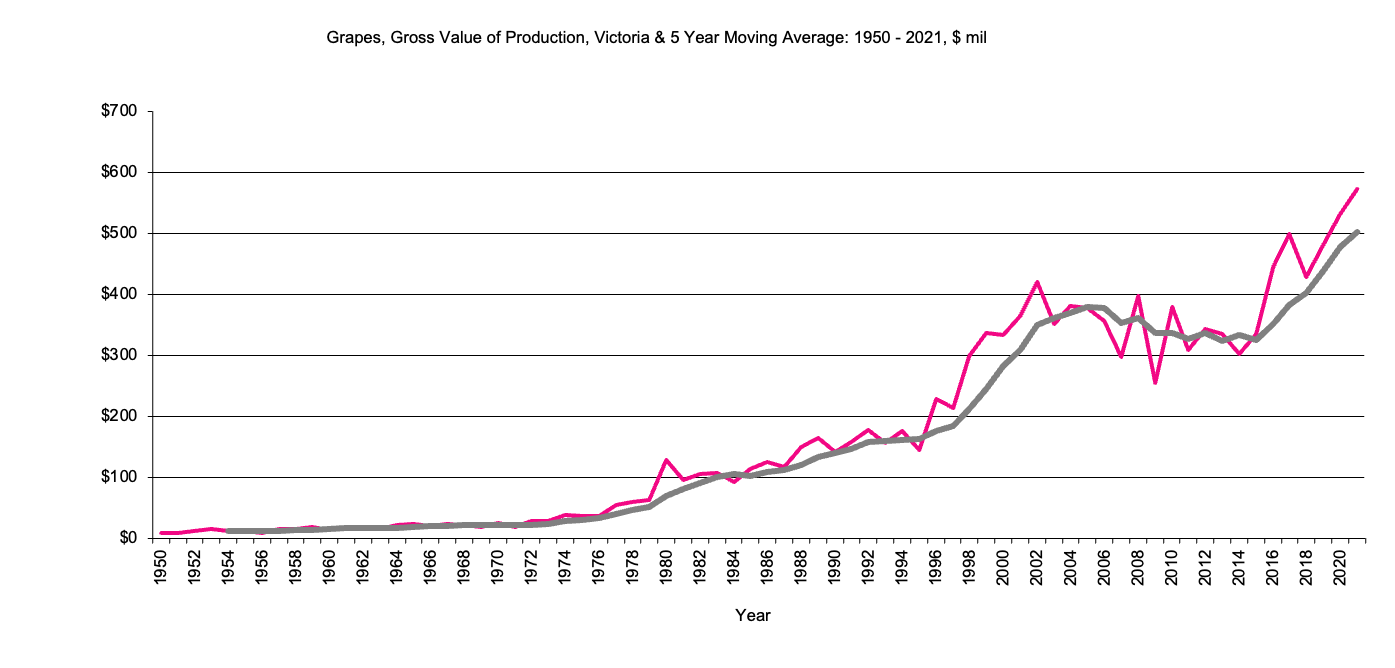 Grapes - Gross Value of production, $m, 5 year moving average Grapes, gross value of  production since 1950