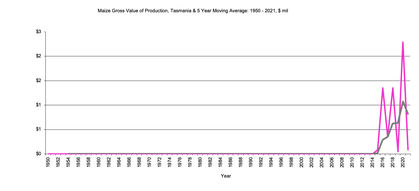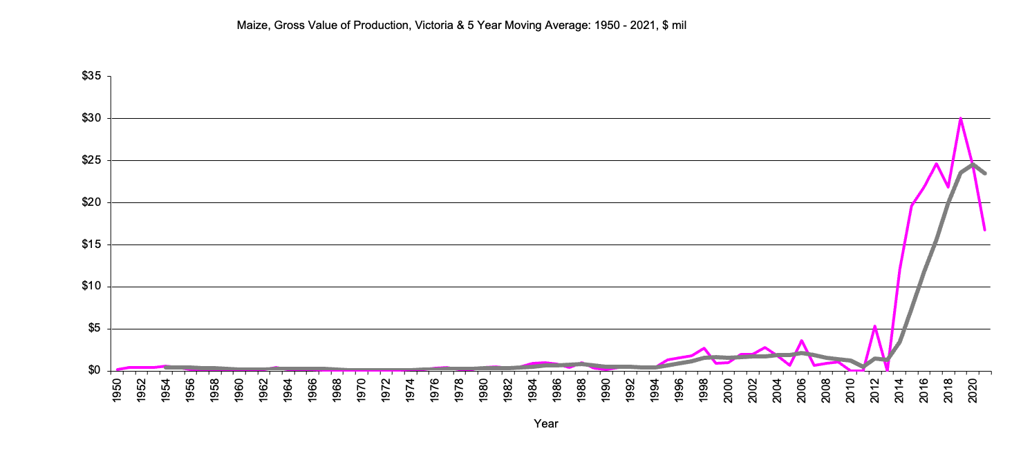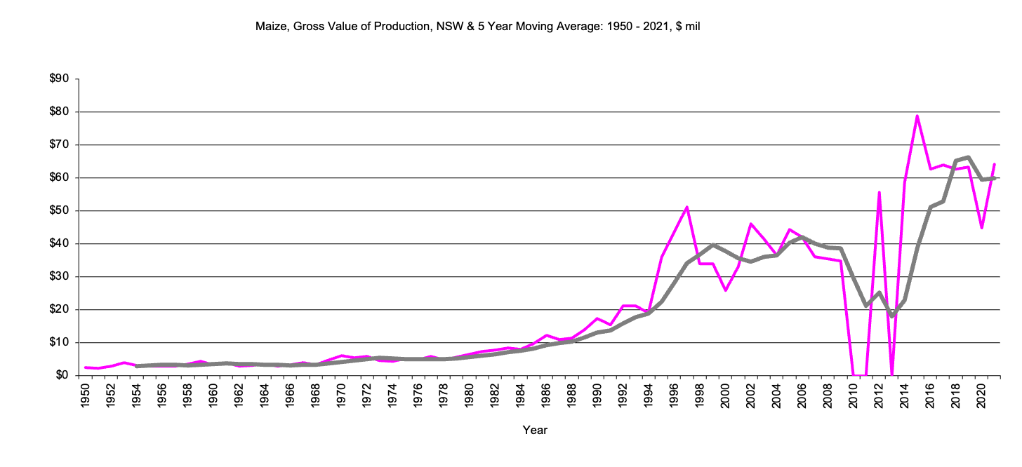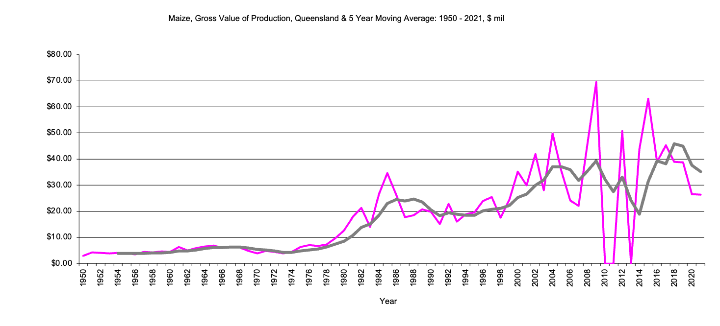 "Maize - Gross Value of production, $m, 5 year moving average"