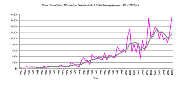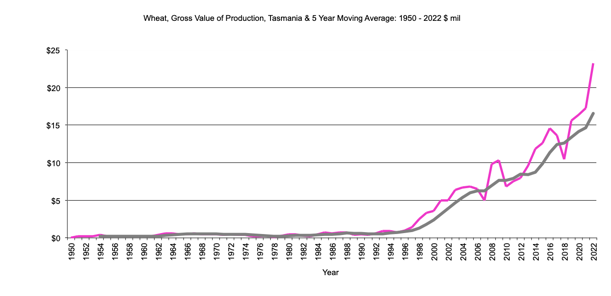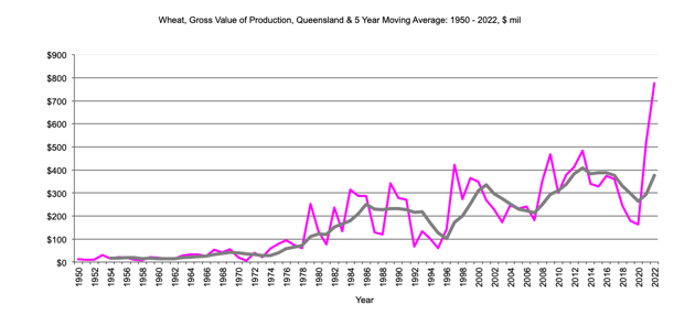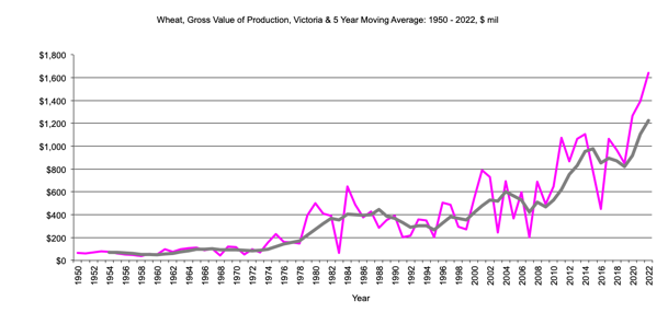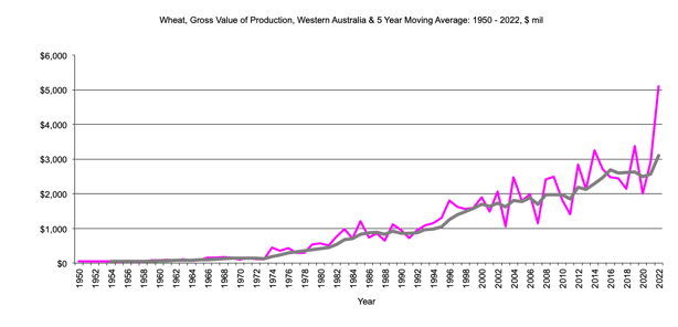 " Wheat - Gross Value of production, $m 5 year moving average"