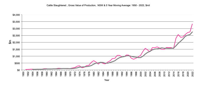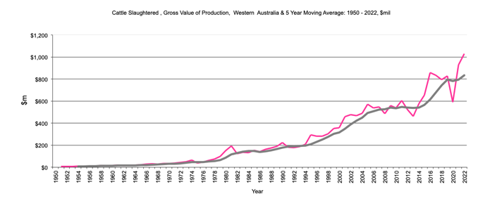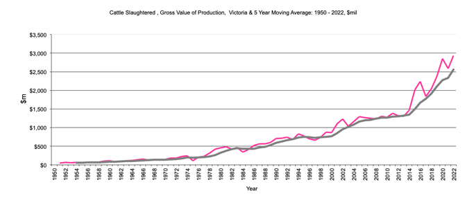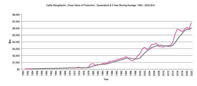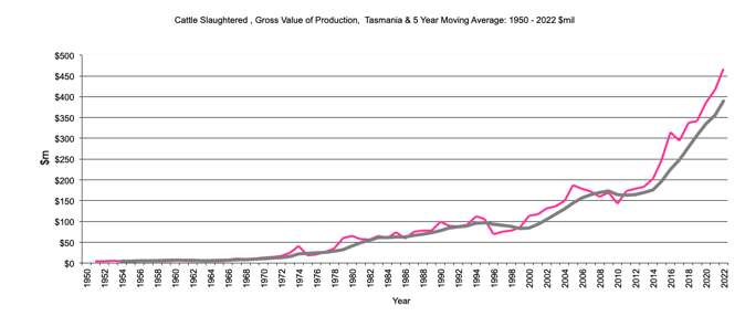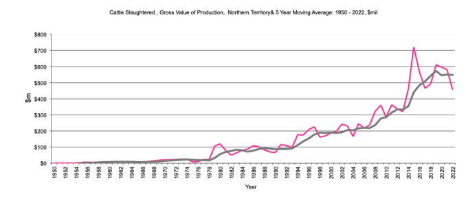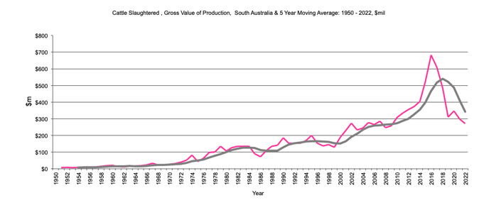 Cattle Slaughtered - Gross Value of production, $m, 5 year moving average