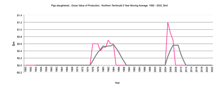 Pigs slaughtered- Gross Value of production, $m, 5 year moving average
