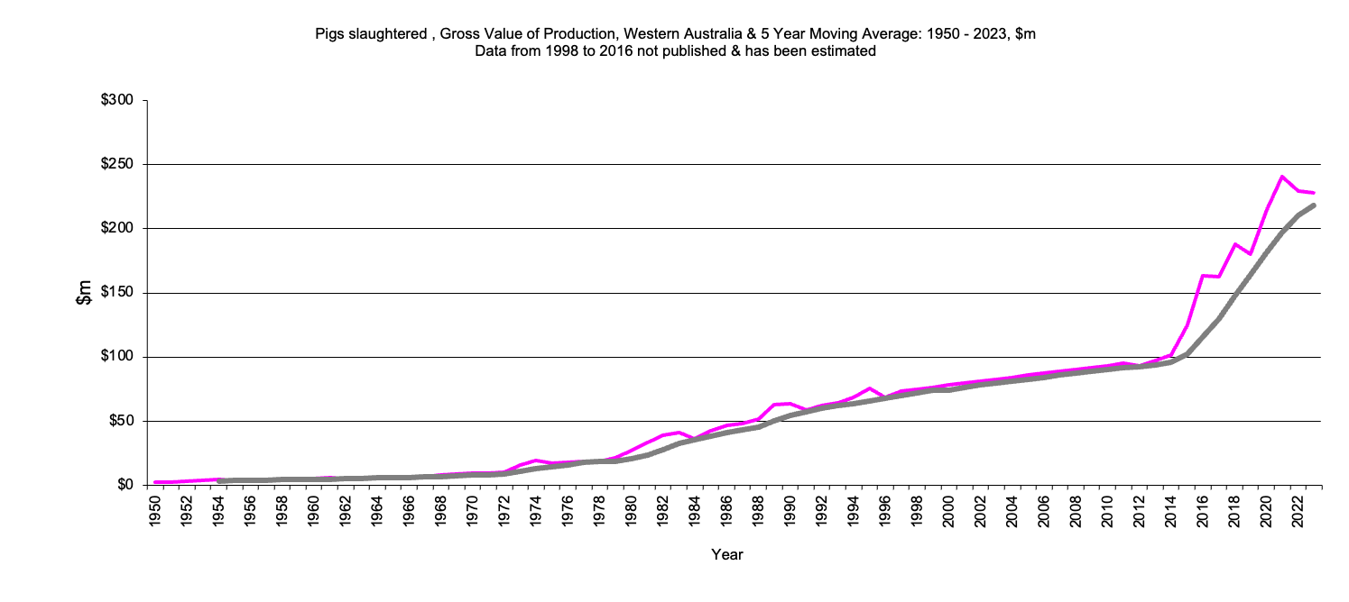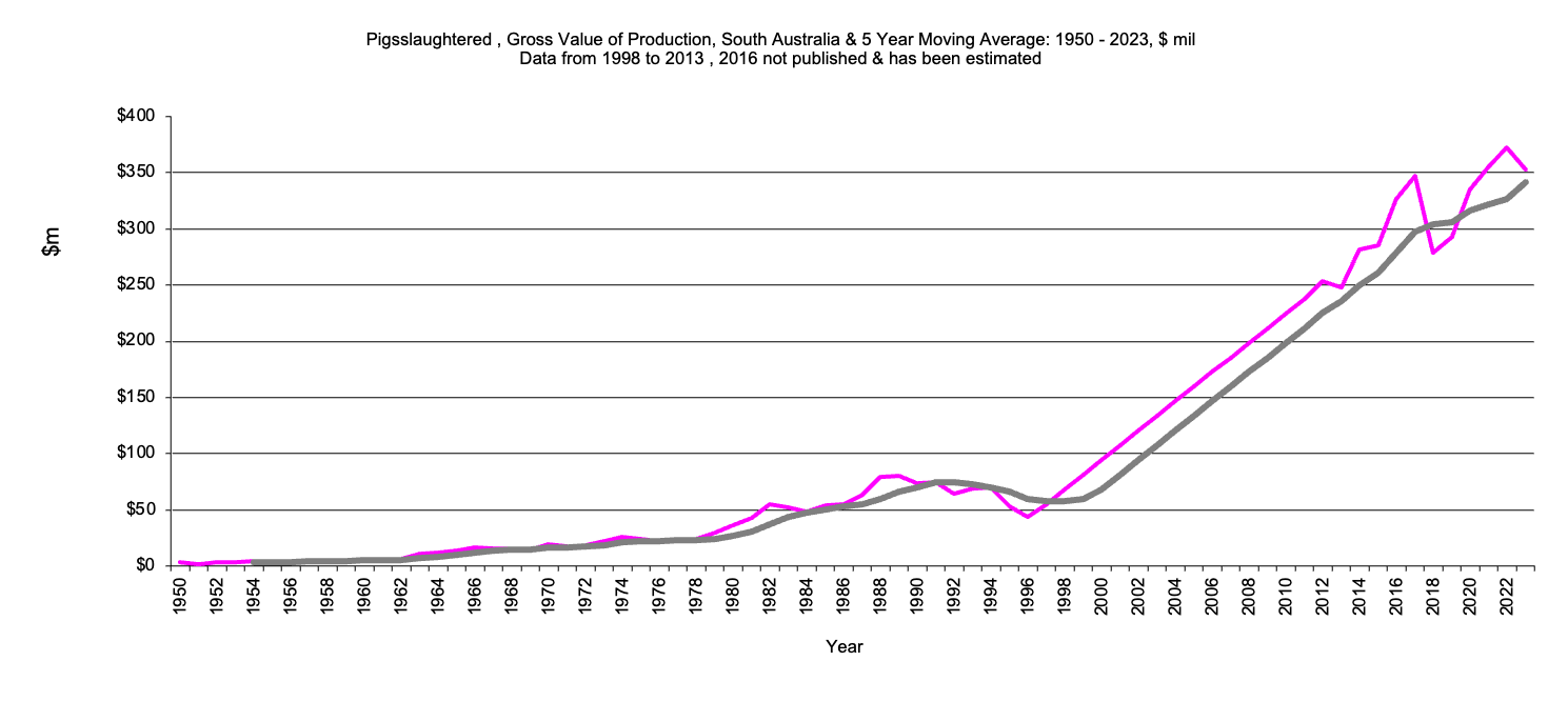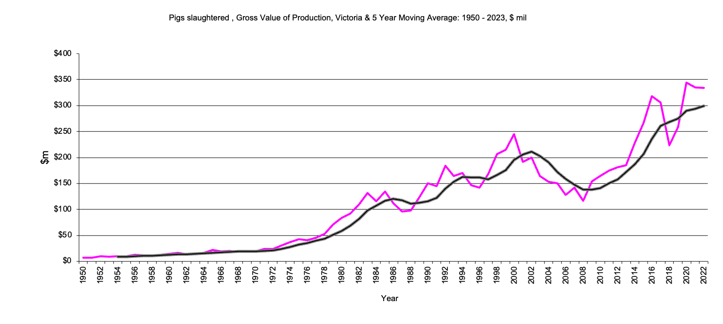 Pigs slaughtered - Gross Value of production, $m, 5 year moving average