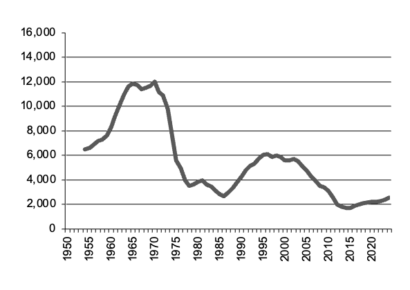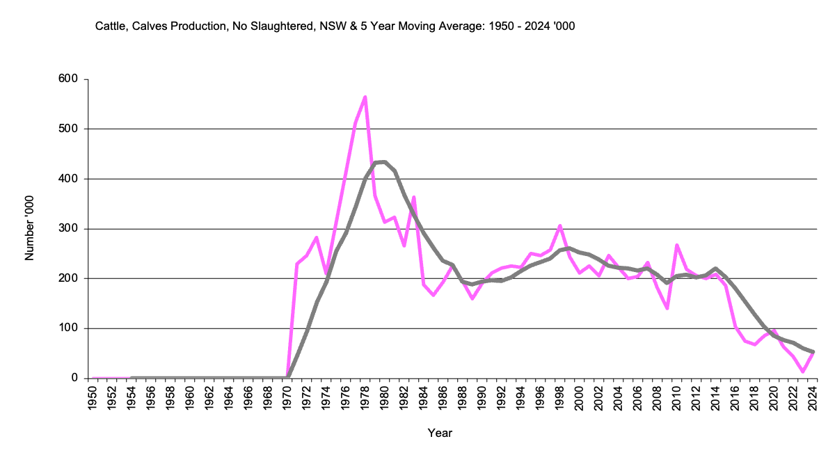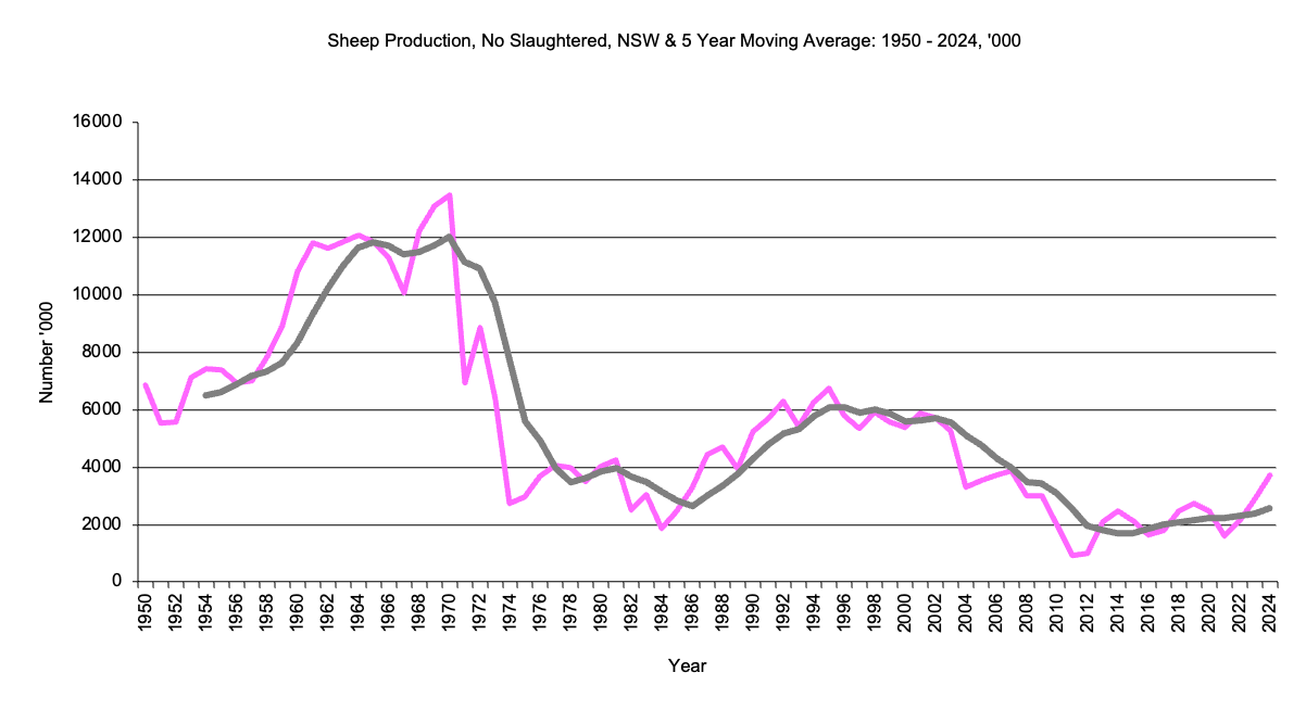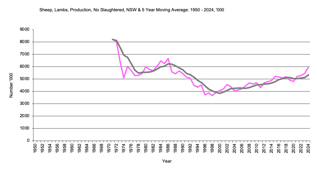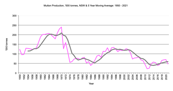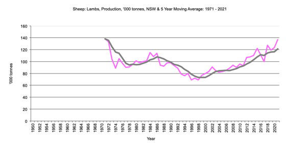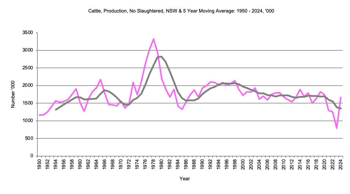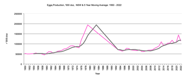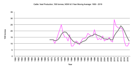 This page has NSW data for livestock producction from 1950 to the present and the 3 year moving average. There is data for cattle sheep poultry and pigs.