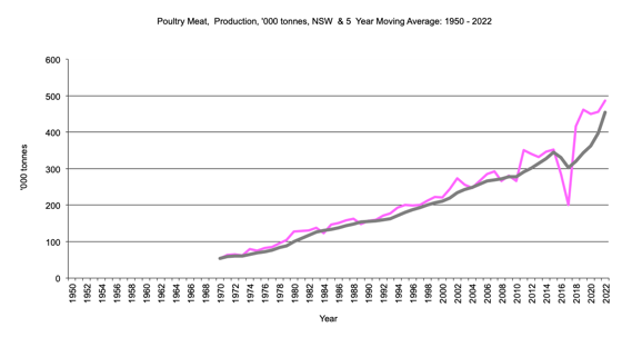 NSW, Chickens, Number Slaughtered 5 year moving average |