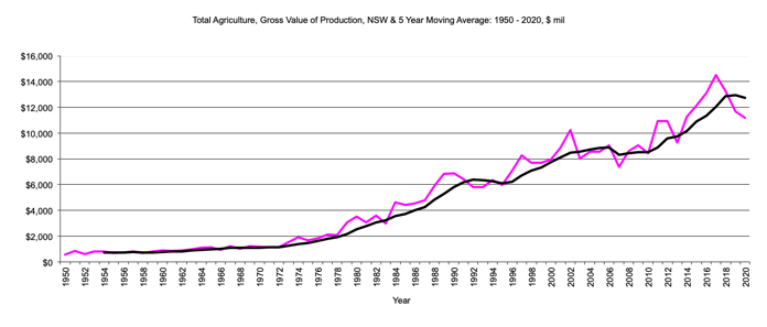 This page has NSW data for Total Agriculture gross value production from 1950 to the present and the 3 year moving average.