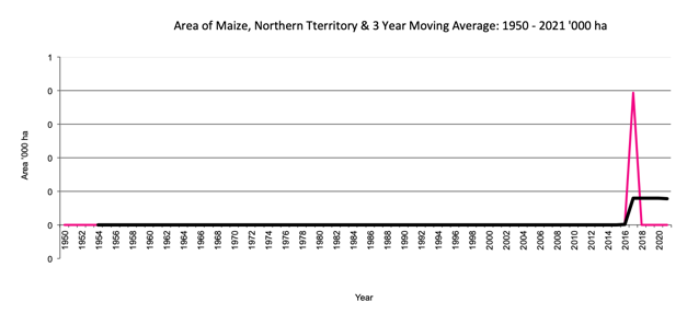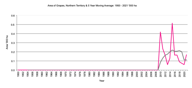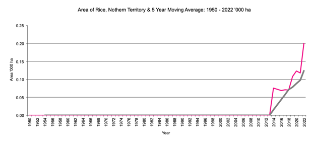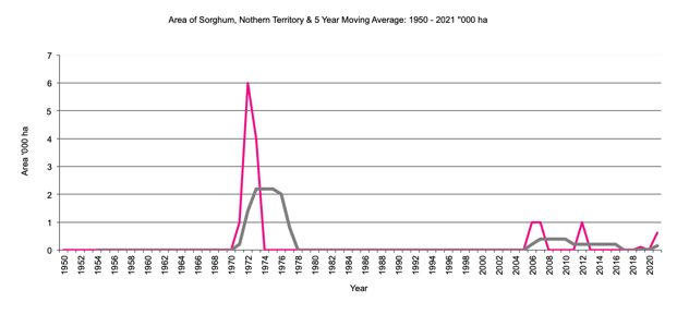 This page has Northern Territory data for crops from 1950 to the present and the 5 year moving average. There is data for the area sown. Data for production and value of production will be added later.