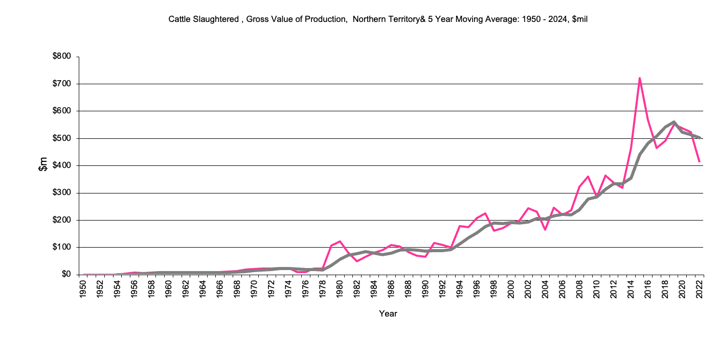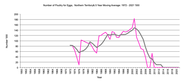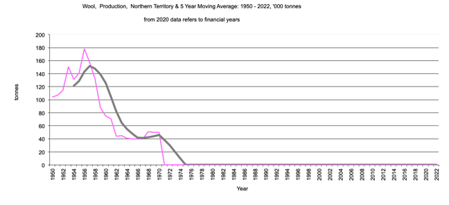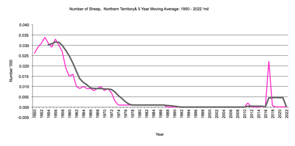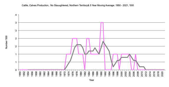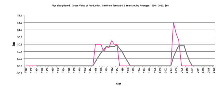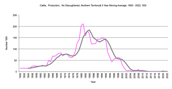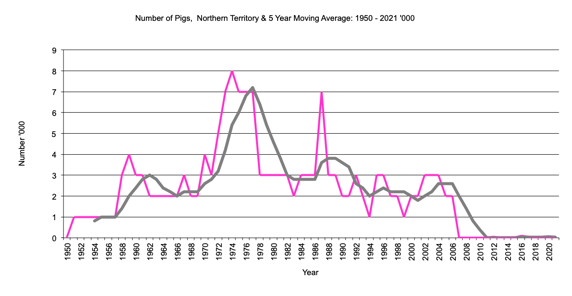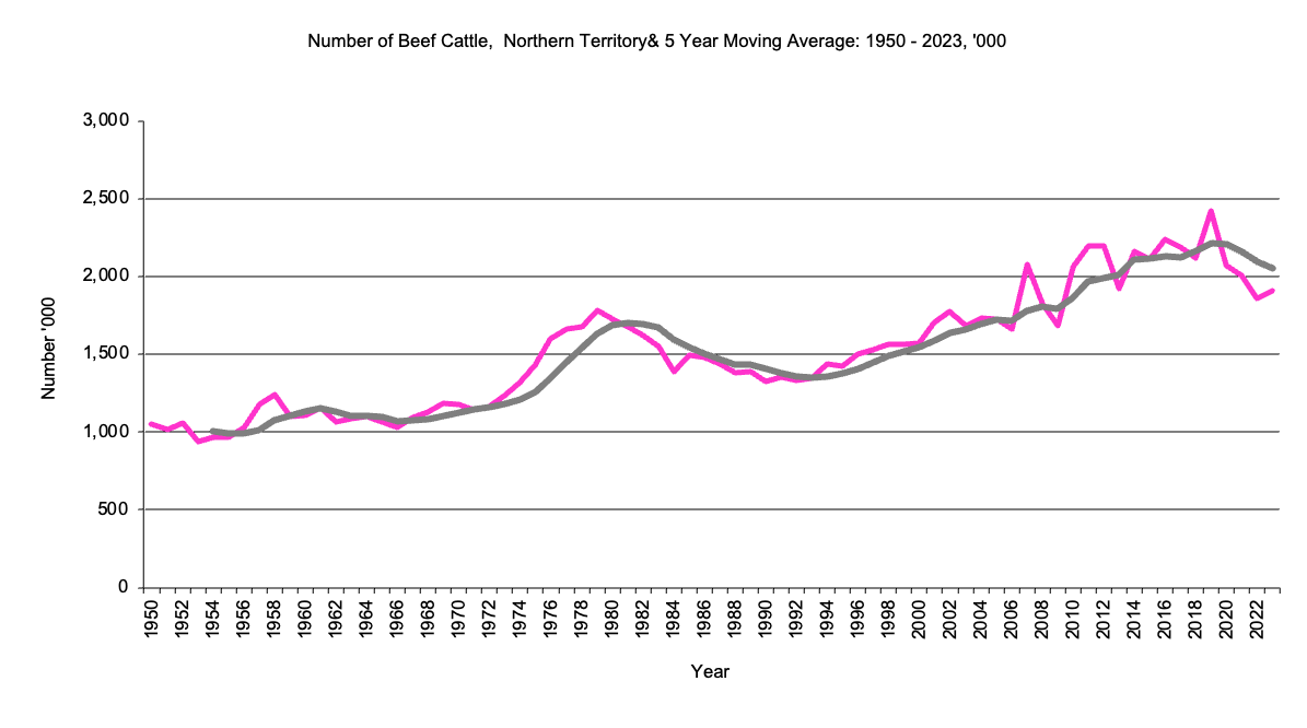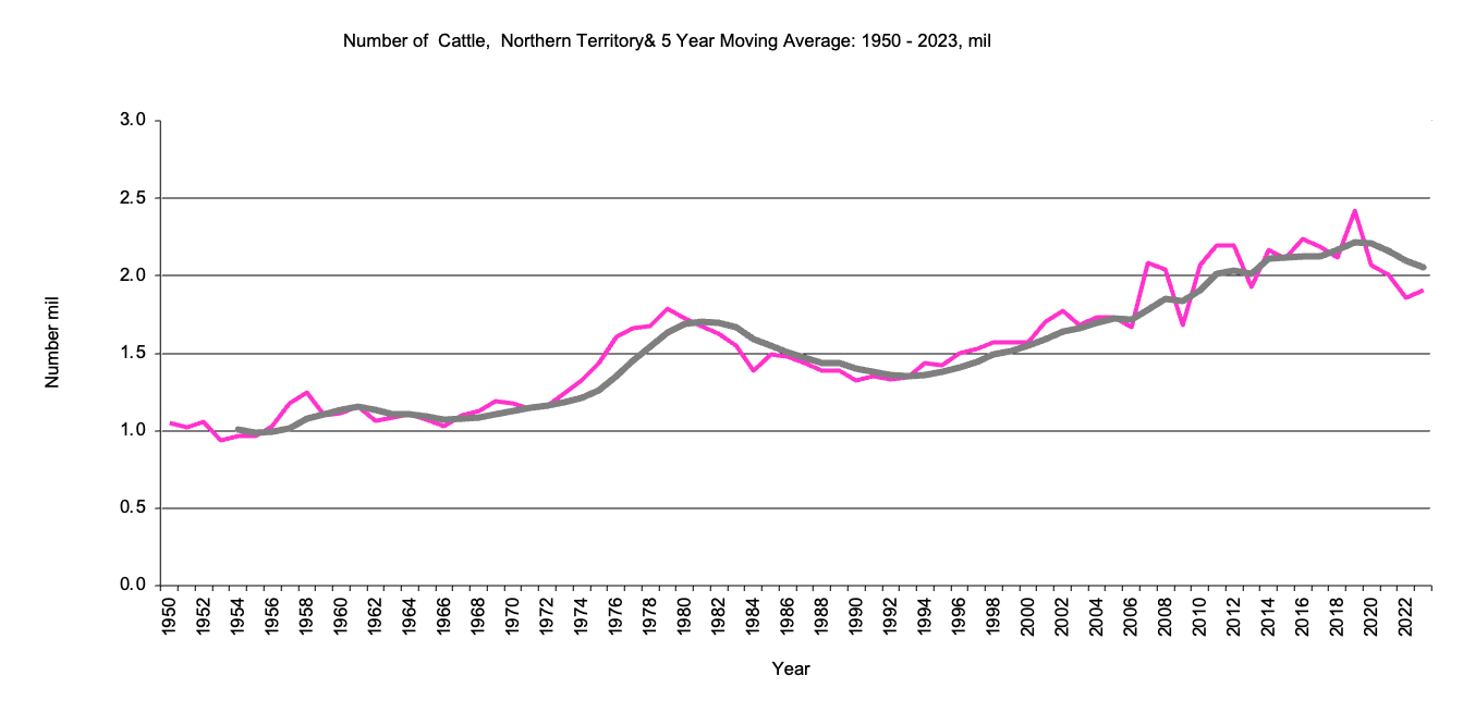 This page has data for Northern Territory livestock numbers from 1950 to the present and the 5 year moving average. There is data for cattle, and pigs, & poultry