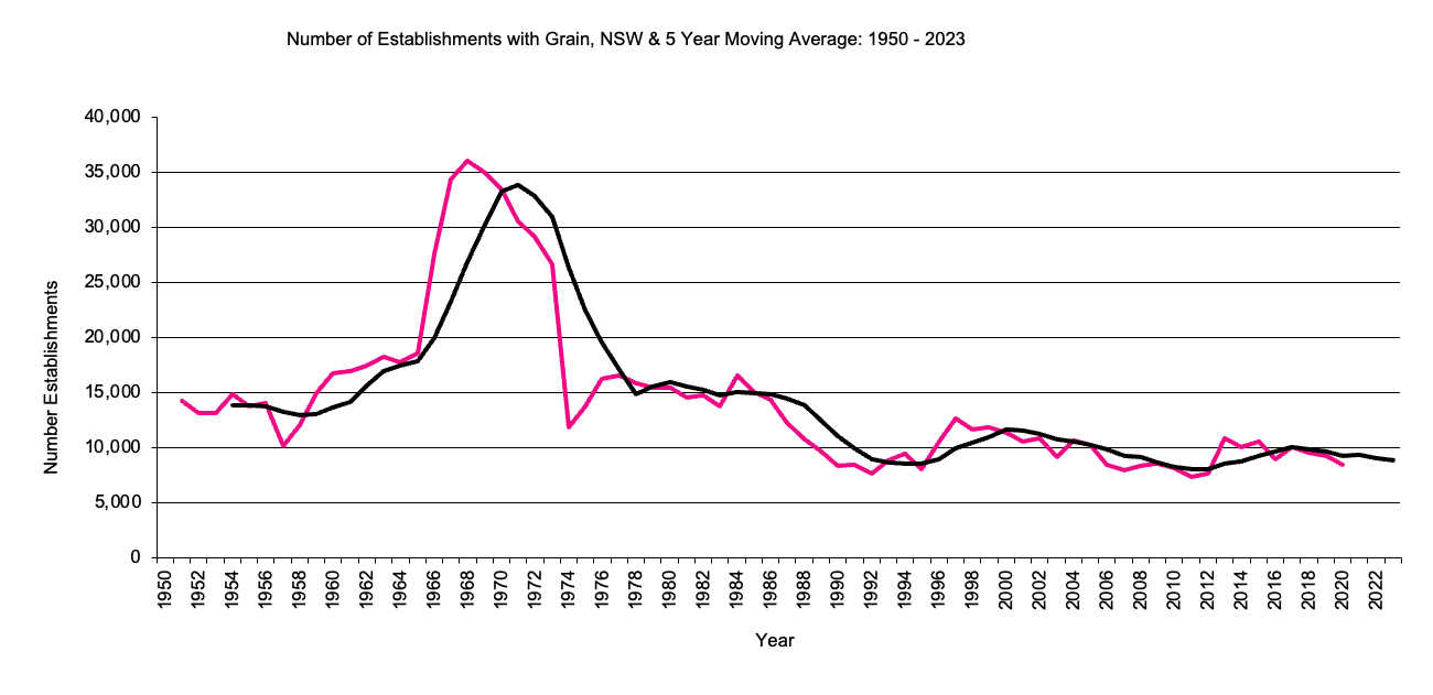 This page has NSW data for agricultural establishments from 1950 to the present and the 5 year moving average. There is data for the area sown.