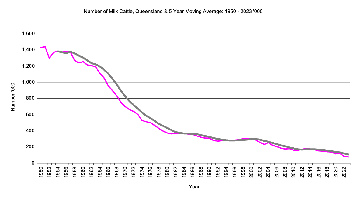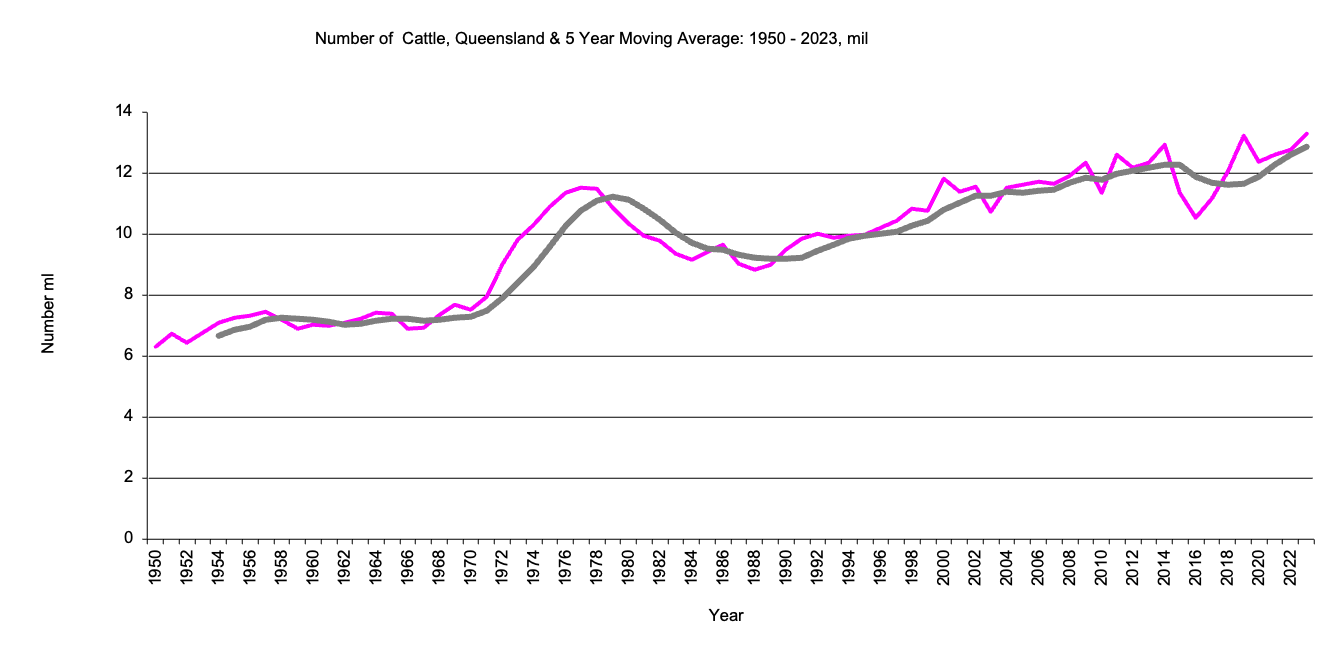 This page has data for Queensland livestock numbers from 1950 to the present and the 5 year moving average. There is data for cattle, sheep, poultry and pigs. Data for production will be added later.