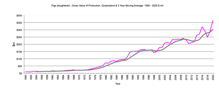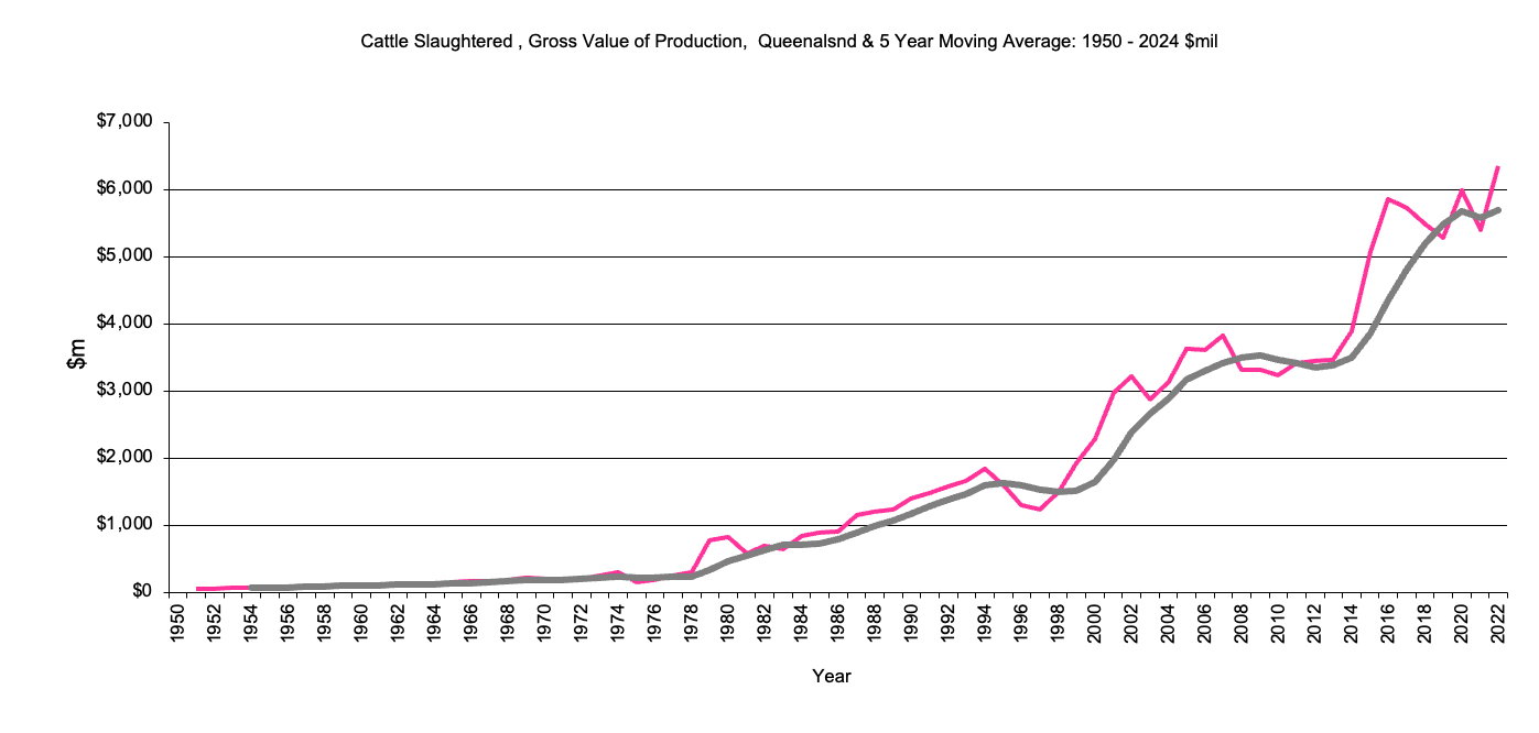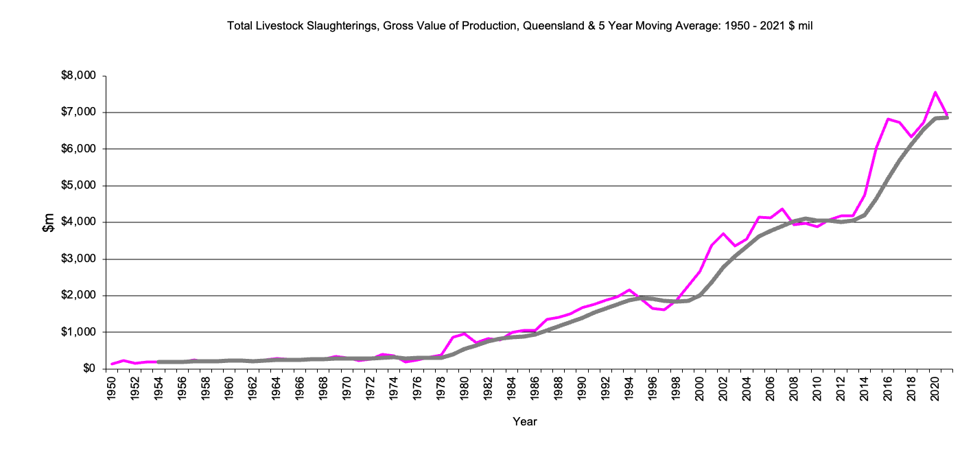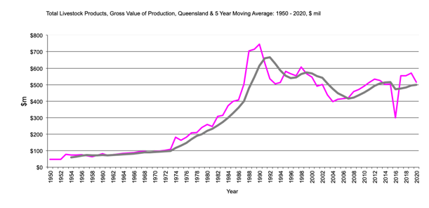 This page has Queensland data for livestock, gross value production from 1950 to the present and the 5 year moving average. There is data for cattle, sheep, poultry and pigs.