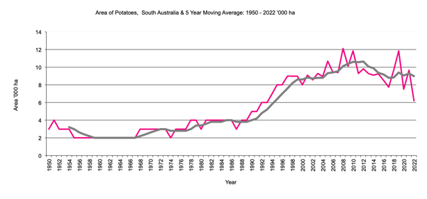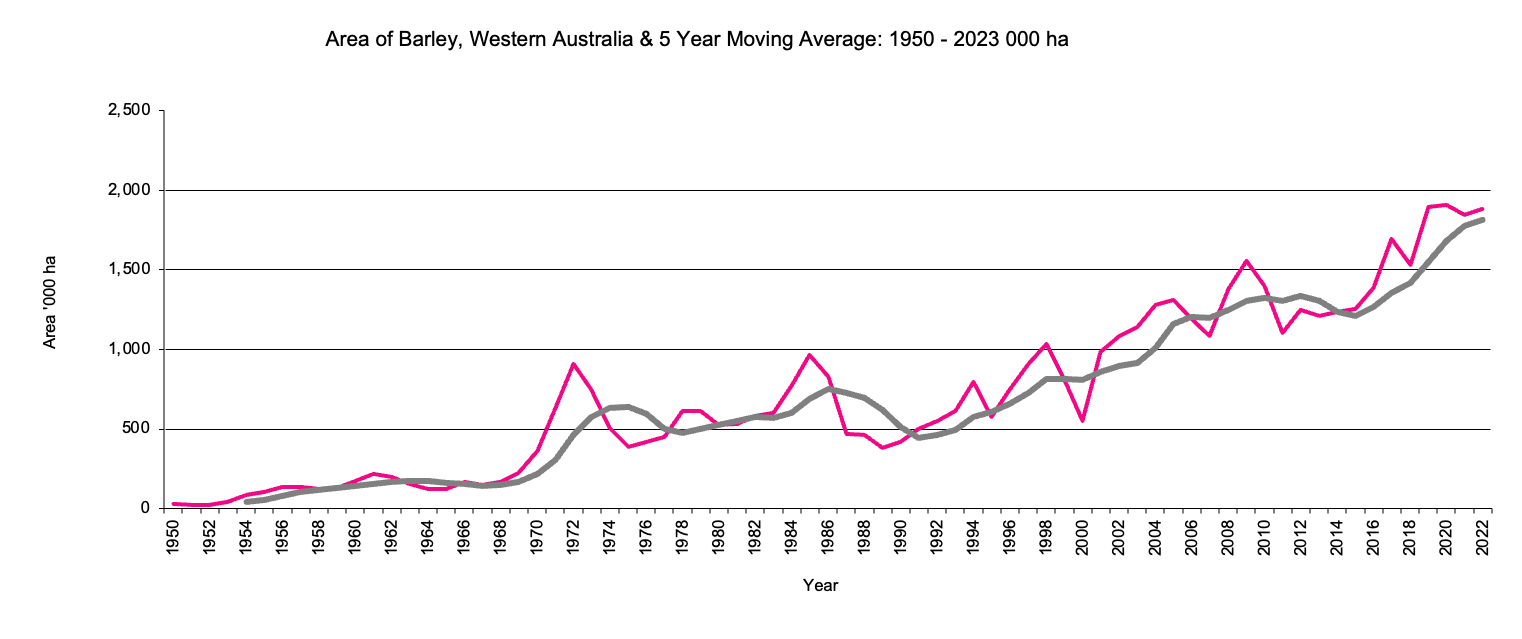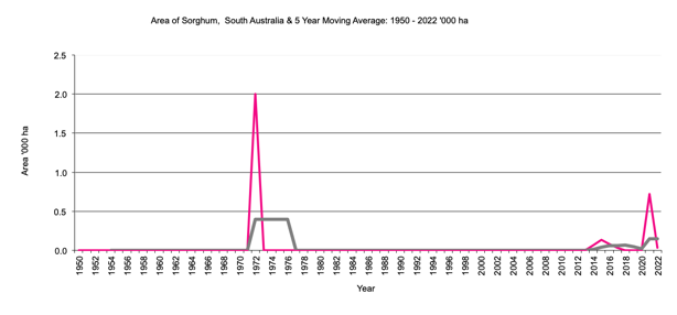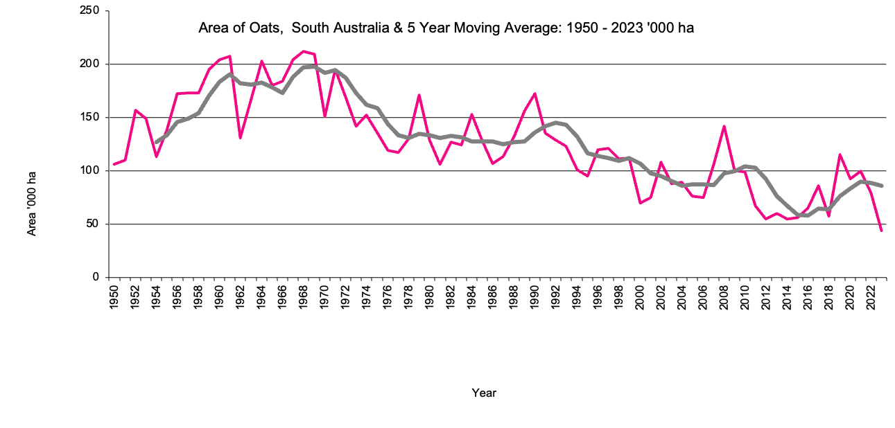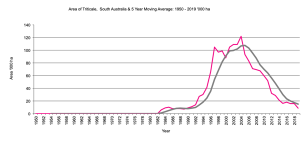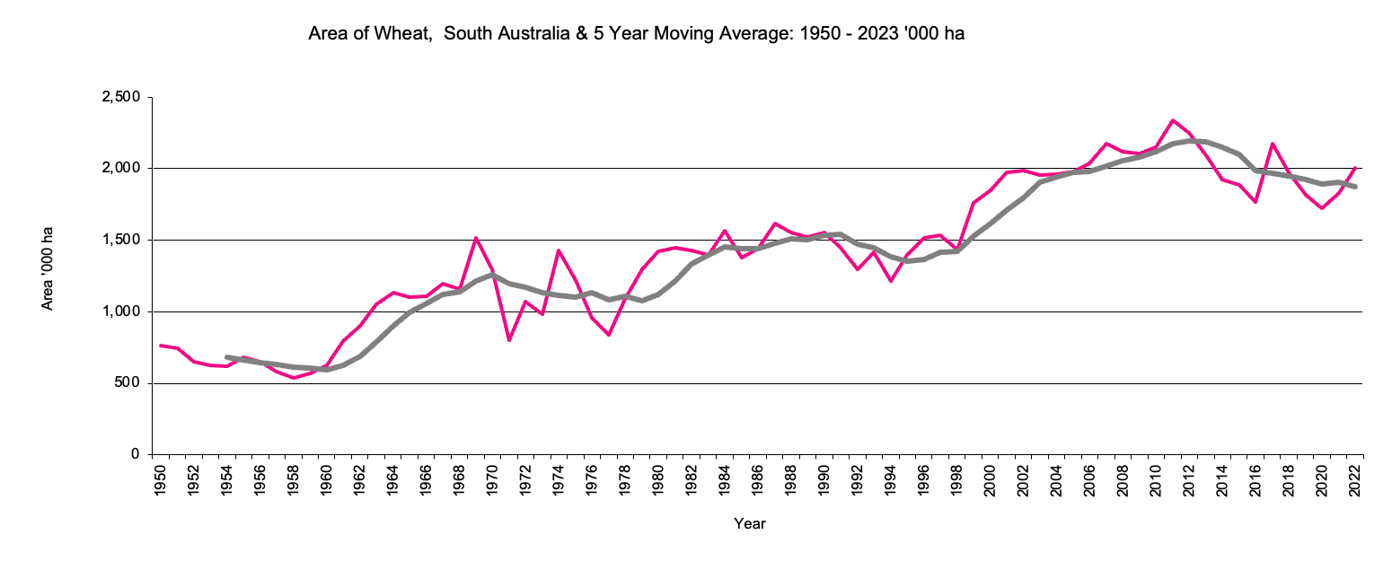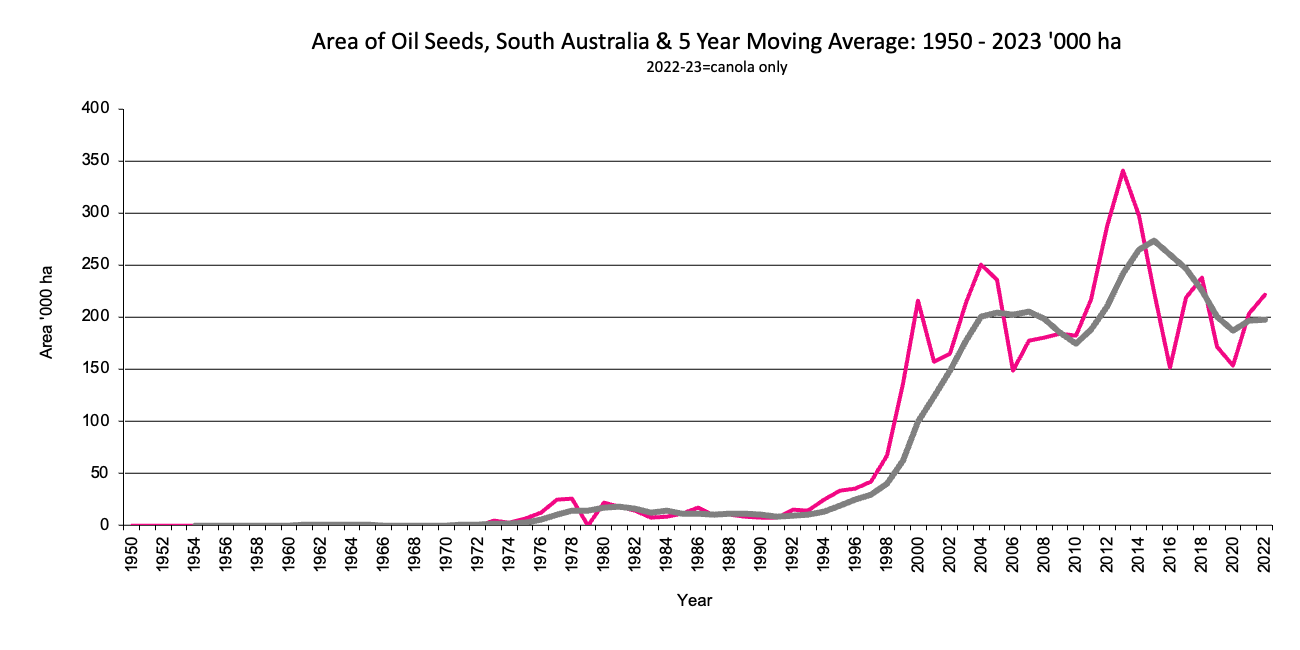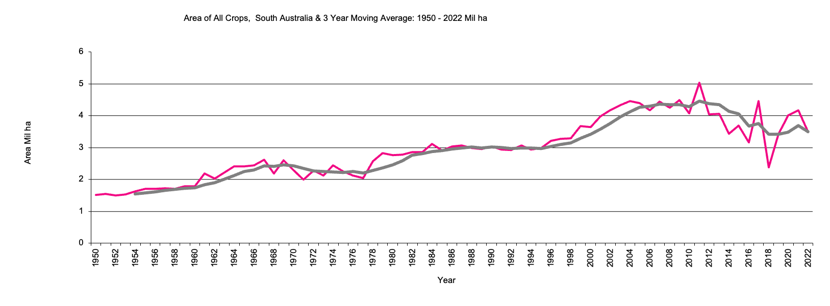 This page has South Australian data for crops from 1950 to the present and the 3 year moving average. There is data for the area sown. The crops to be included here are:all crops, barley, oats, wheat, triticale, grapes, oilseeds, and potatoes.