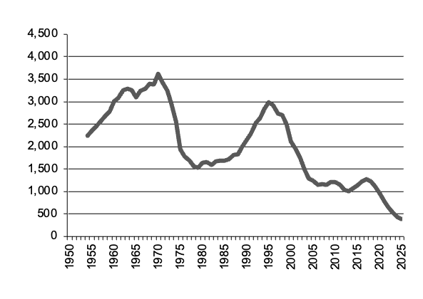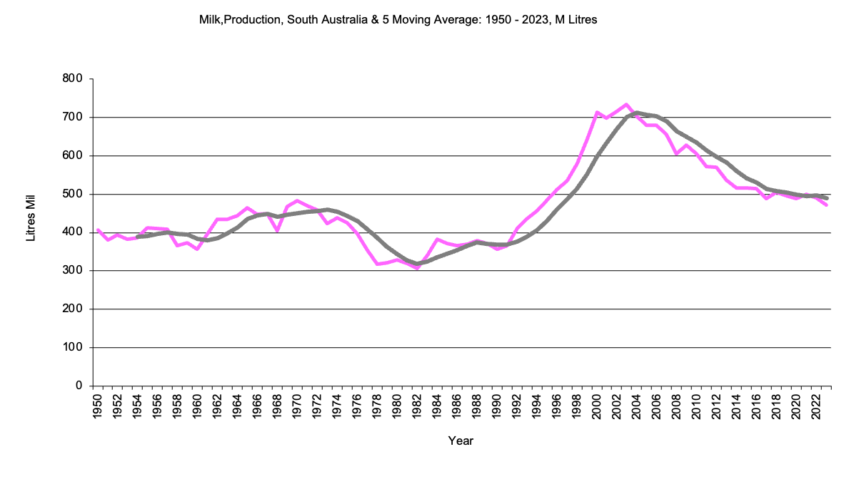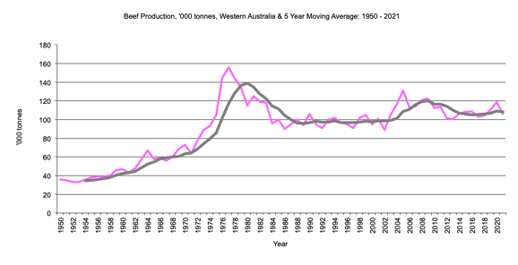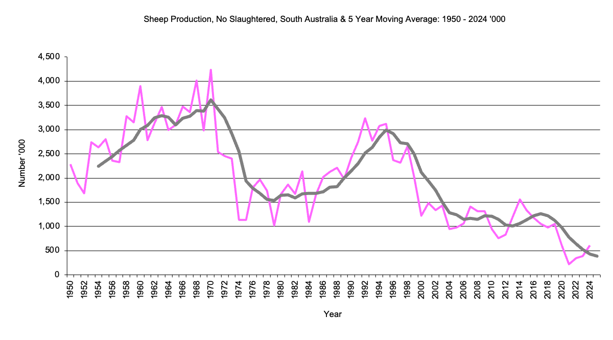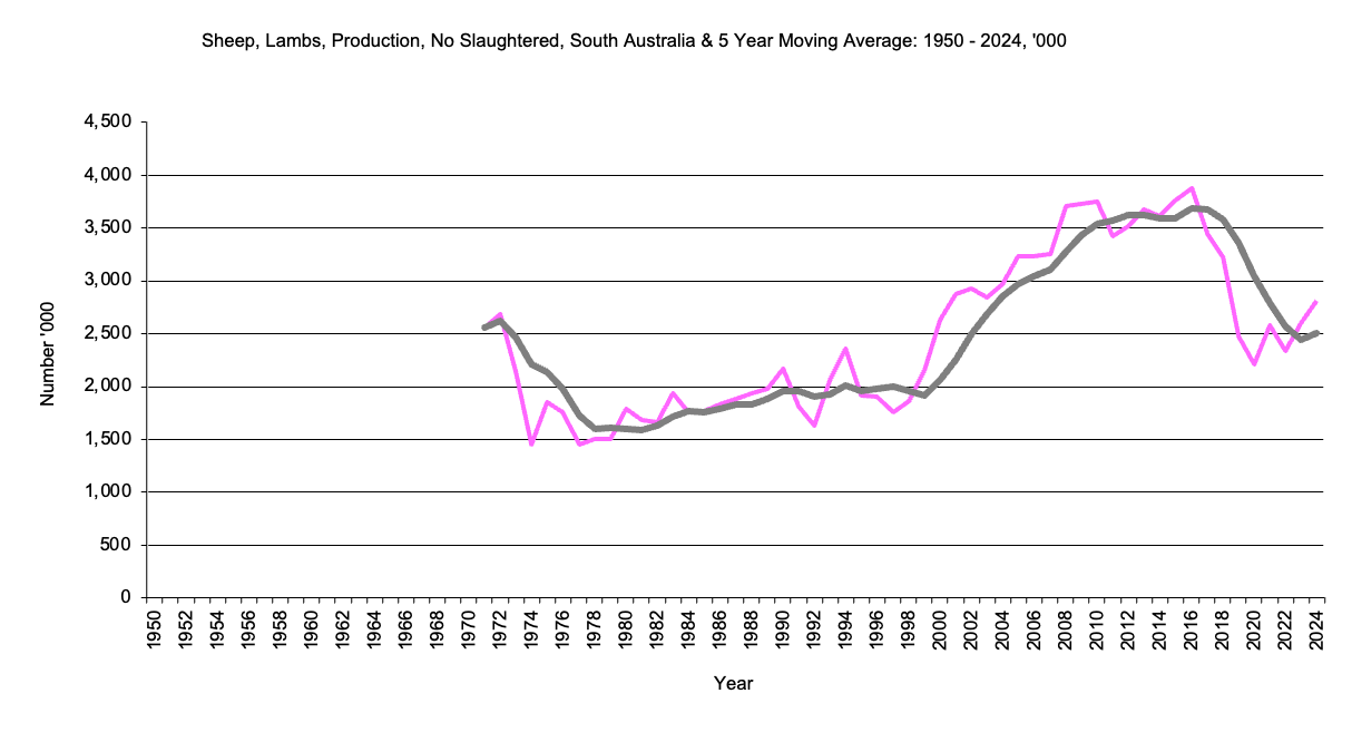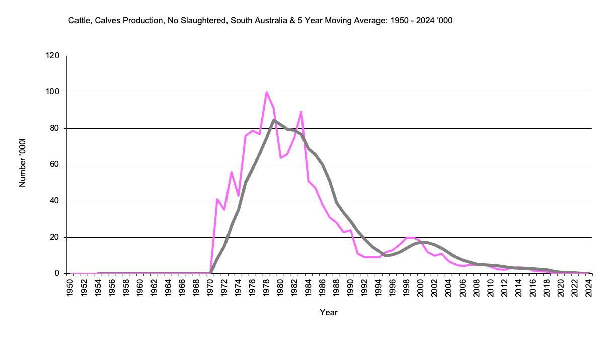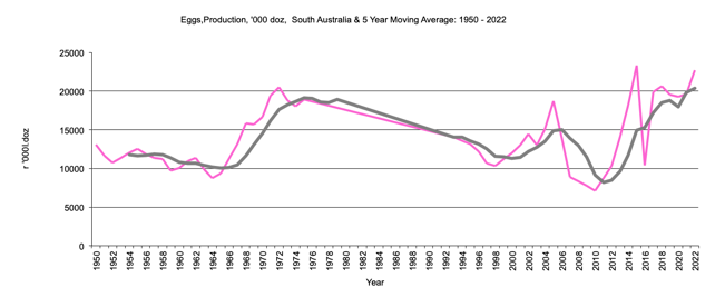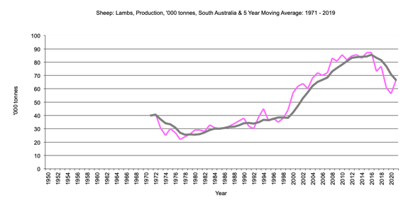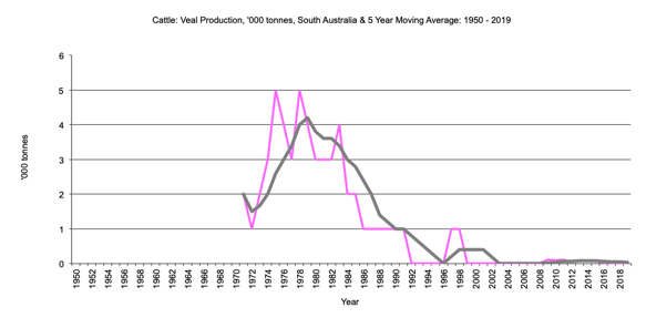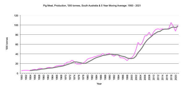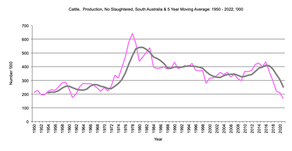 This page has South Australia data for livestock producction from 1950 to the present and the 3 year moving average. There is data for cattle sheep poultry and pigs.