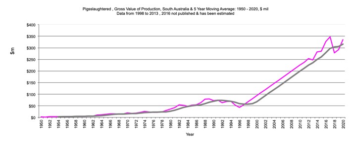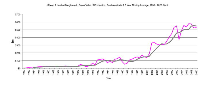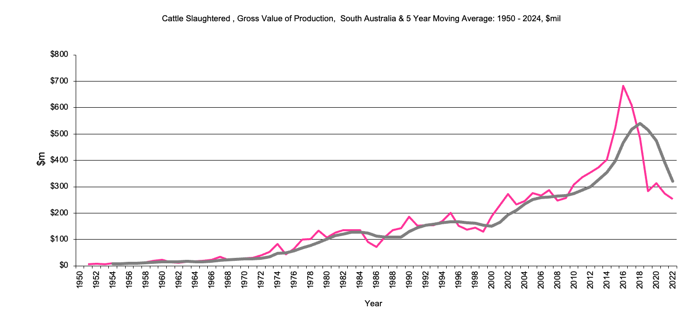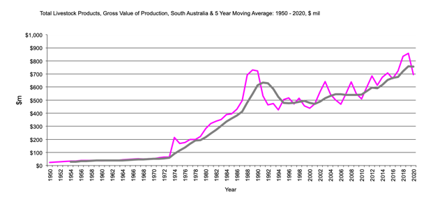 This page has South Australia data for livestock, gross value production from 1950 to the present and the 3 year moving average. There is data for cattle, sheep, poultry and pigs.