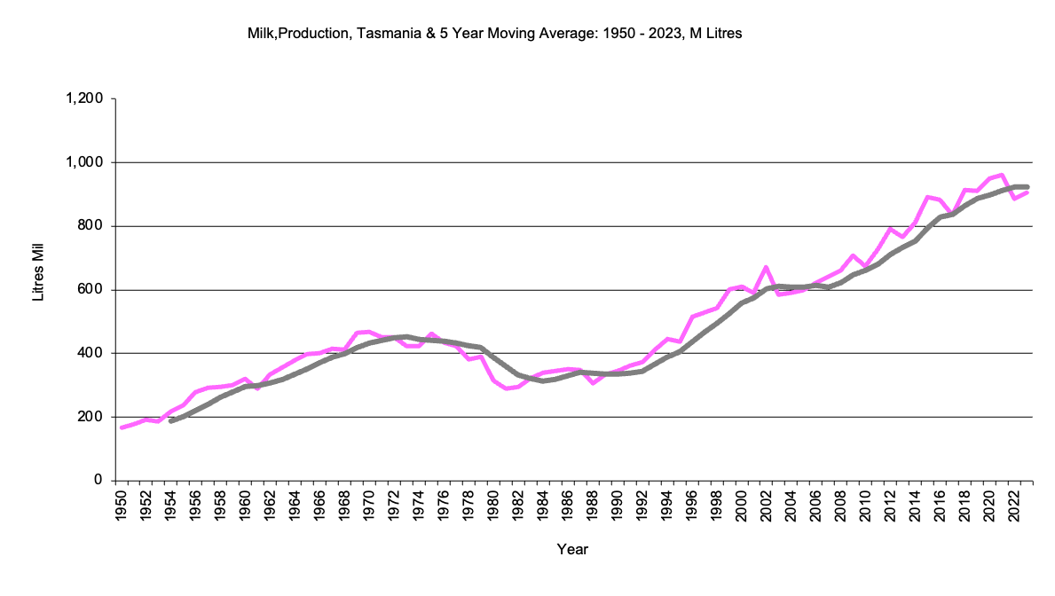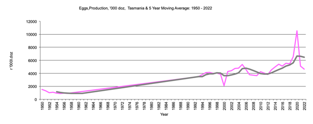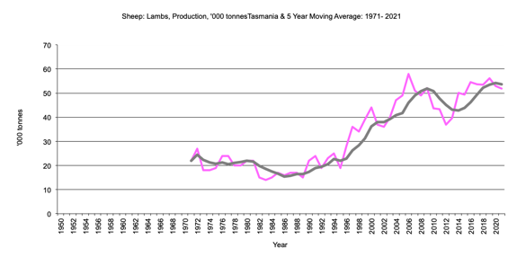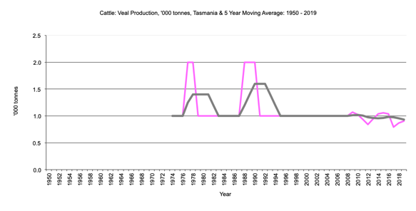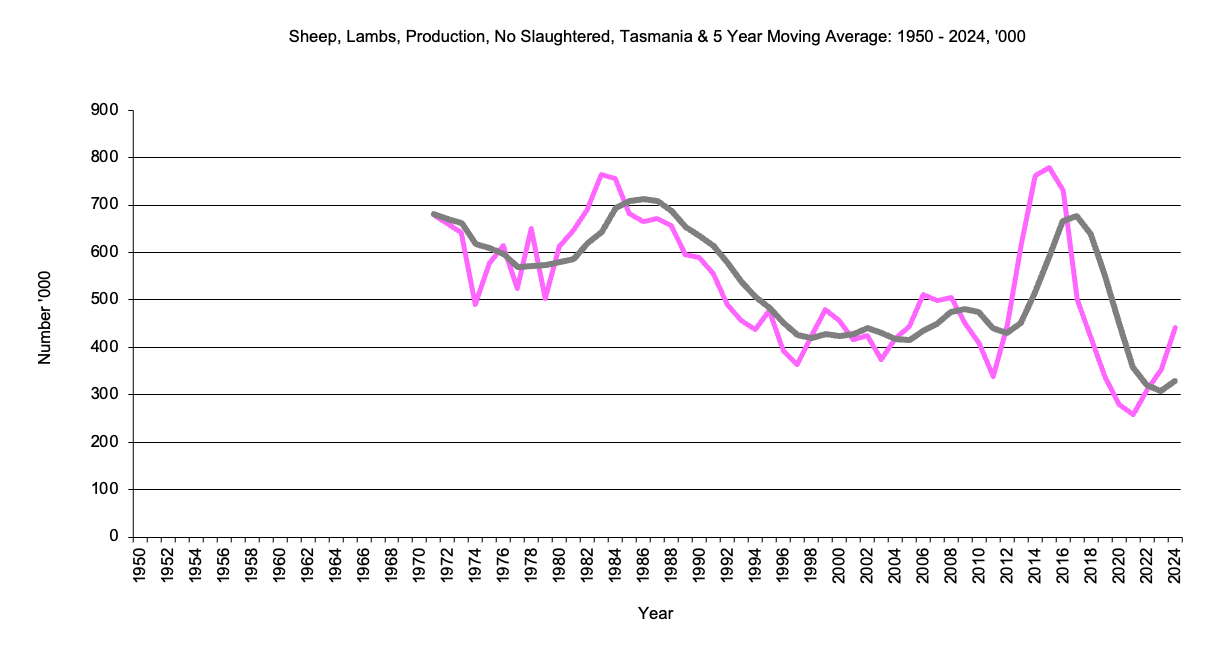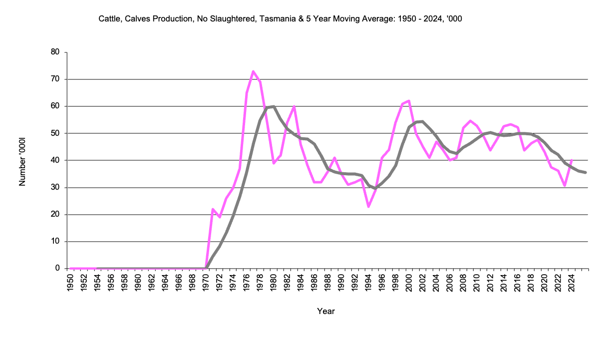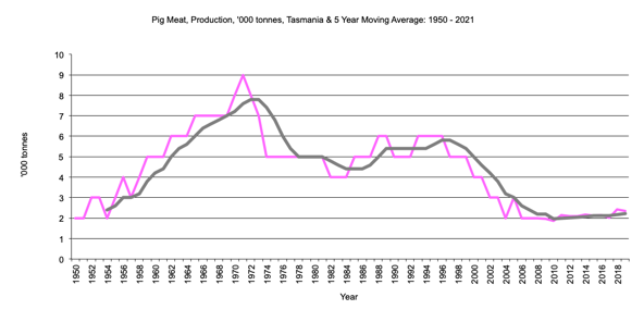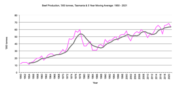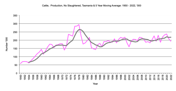 This page has Tasmania data for livestock producction from 1950 to the present and the 3 year moving average. There is data for cattle sheep and pigs.
