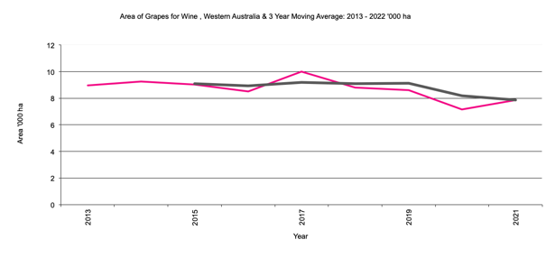 Area of grapes for Wine in '000 hectares, 3 year moving average