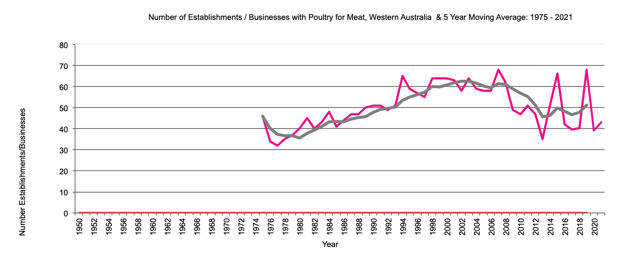 Western Australia Number of Establishments/Businesses Poultry for Meat graph |