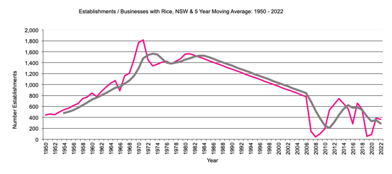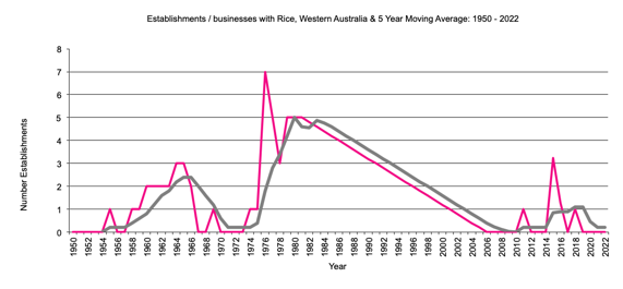 "Number of Establishments / Businesses Growing Rice since 1950, 5 year moving average"