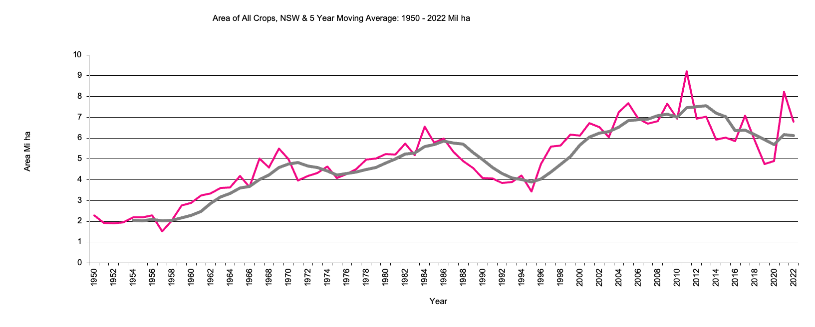 Area of crops has reached over 7mil hectares. Previously the area peaked around 1969,1983, 2005 and 2013 suggesting around 15 year cycles. The area of all crops is dominated by the area sown to wheat.