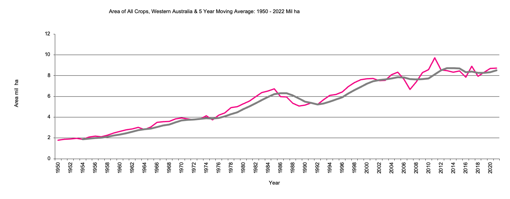 Area of all crops in million hectares, 5 year moving average.