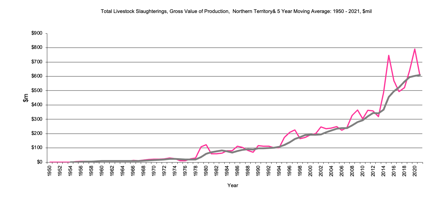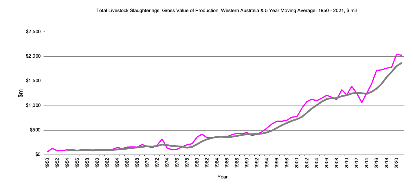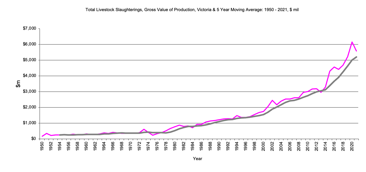 Total Livestock Slaughtered - Gross Value of production, $m, 5 year moving average